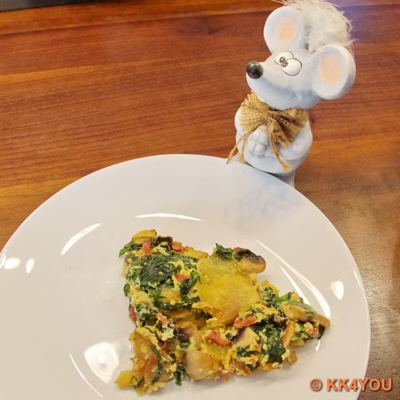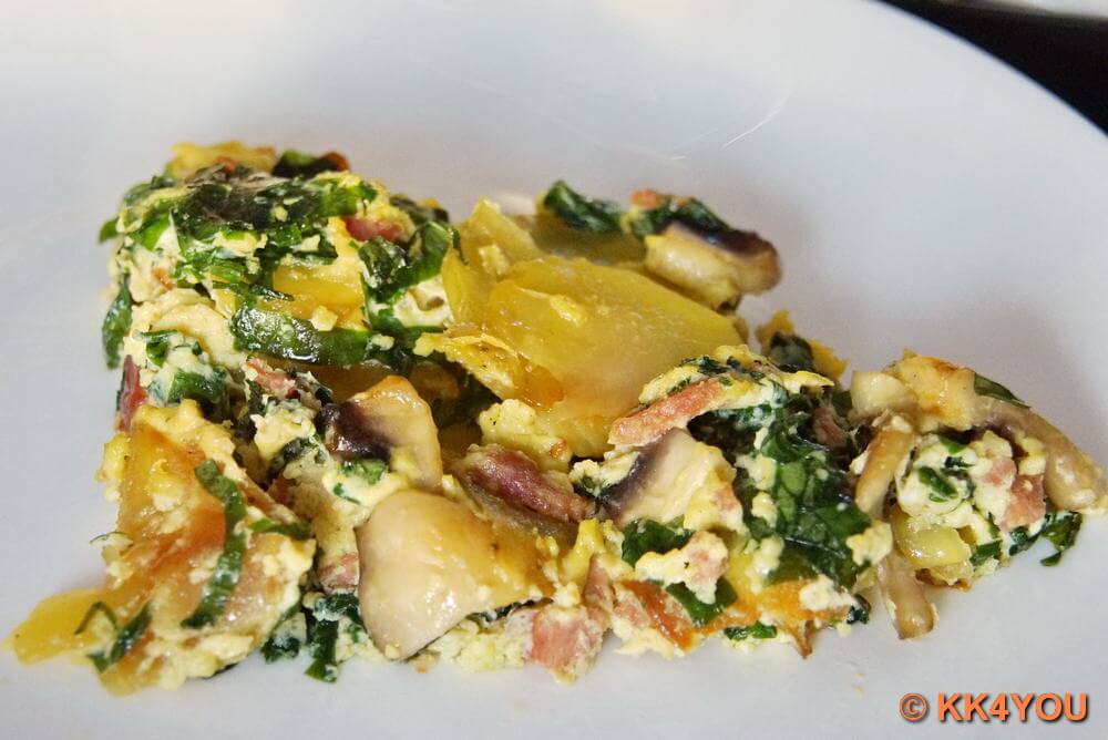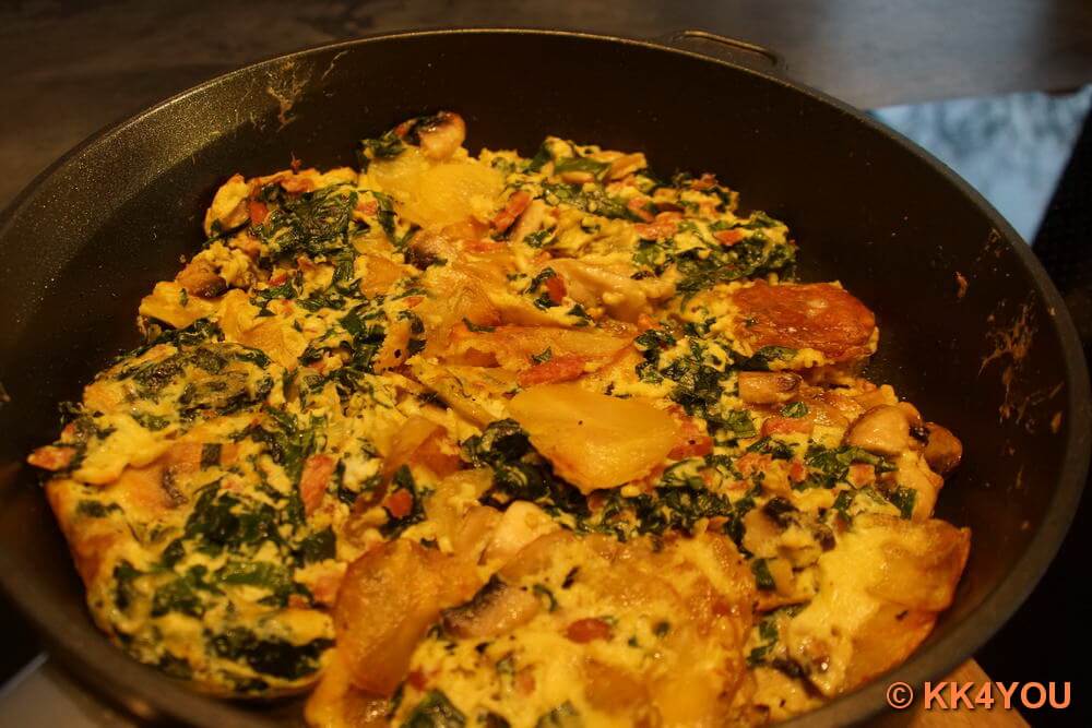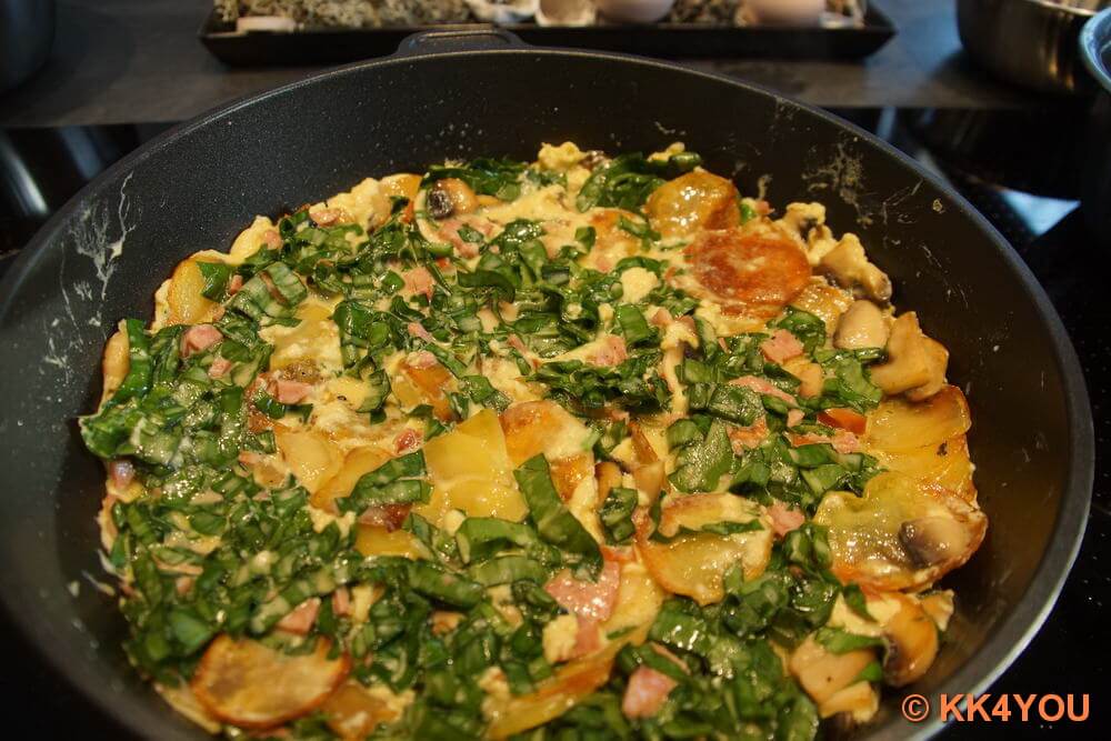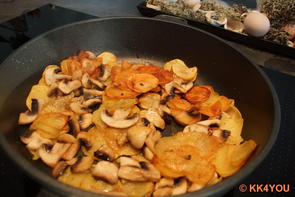 - Mischung unter die Kartoffel-Champignon heben und in der Pfanne stocken lassen.