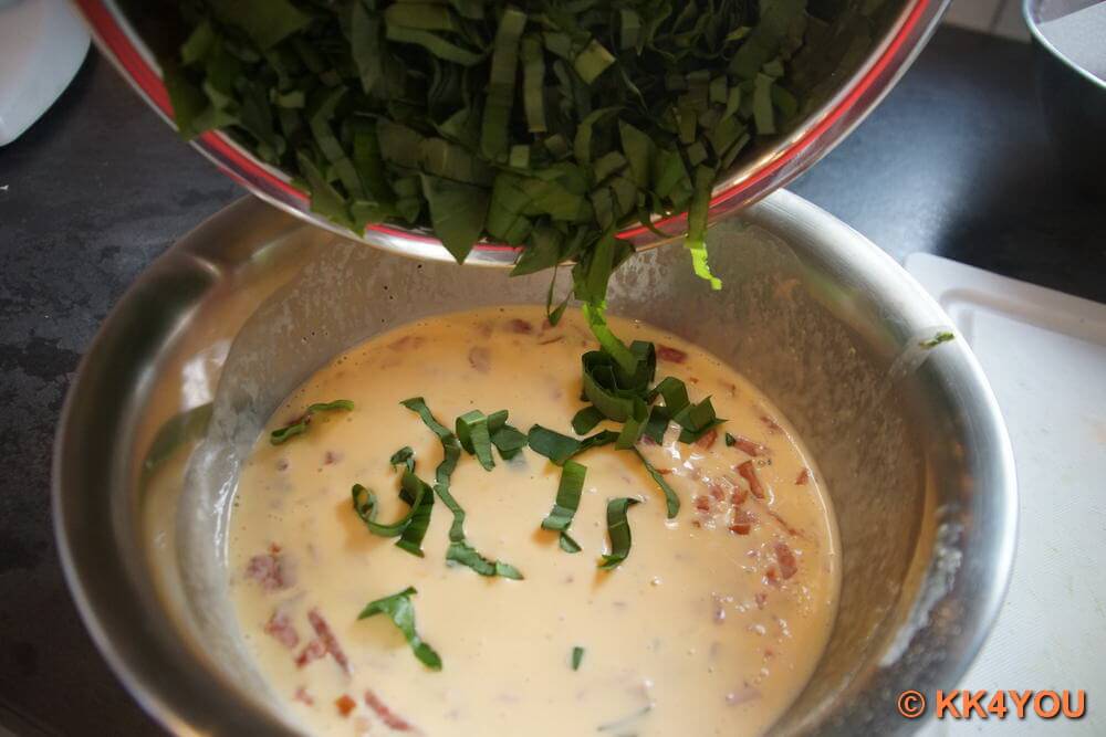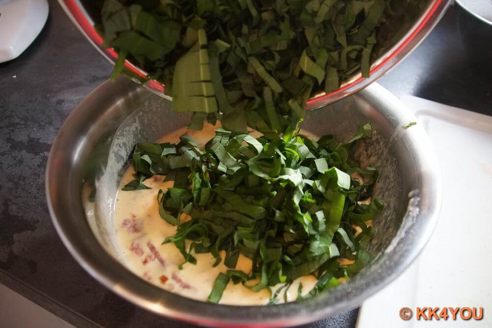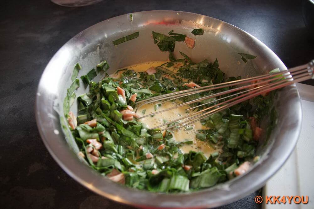 - Eier mit Schlagsahne verrühren und dann Bärlauch, Debrecziner, Salz und Pfeffer mit der Sahne-Eimischung mischen.