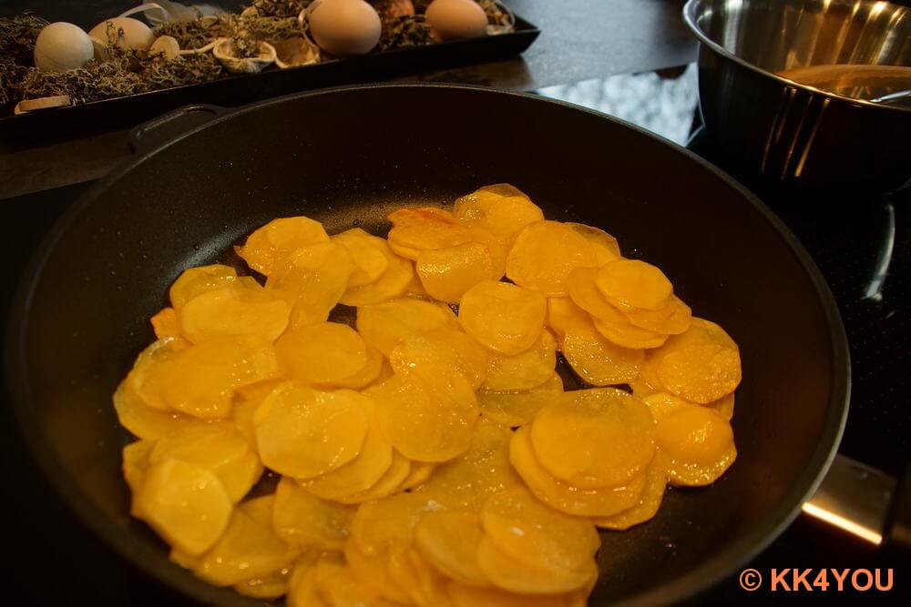 - Kartoffelscheiben in 3 EL Braune Butter ca. 8 Minuten goldbraun anbraten. Alternativ kann auch Olivenöl verwendet werden, dann darf die Brattemperatur aber nicht so hoch gewählt werden.