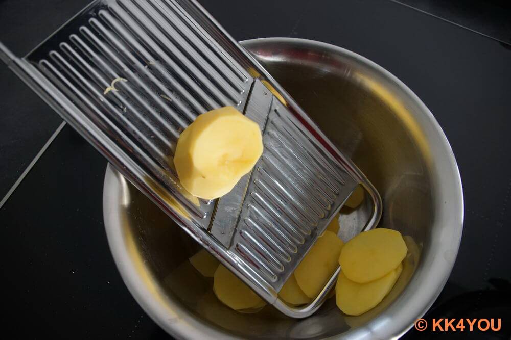 - Kartoffeln in dünne Scheiben schneiden. Ich verwende dazu meinen Gemüsehobel, damit erreiche ich wunderbare gleichmäßige dünne Scheiben.
