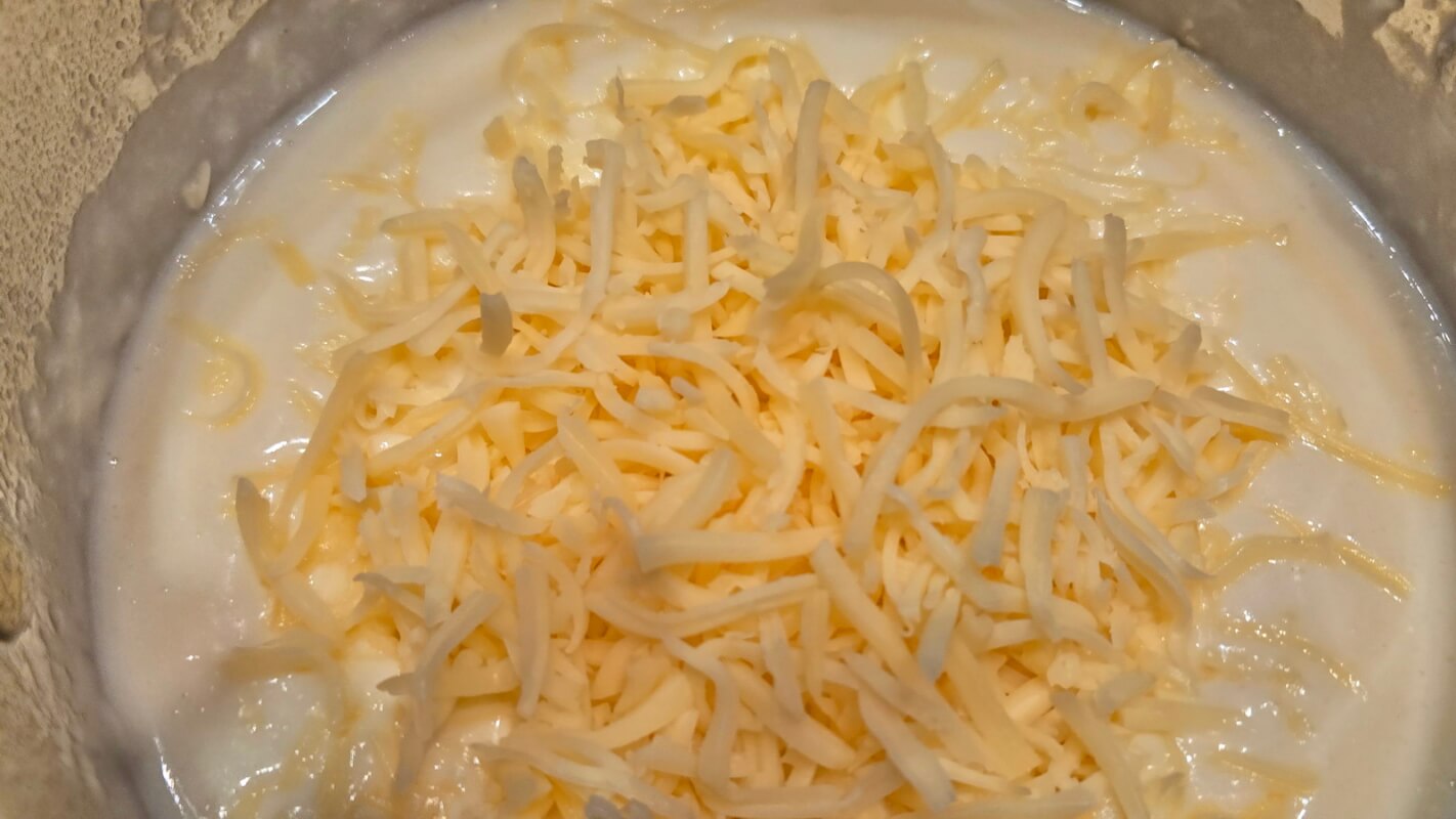 6. Die Sahne angießen und die Hälfte vom geriebenen Käse in den Topf geben und verrühren, bis der Käse geschmolzen ist. Die Sauce dabei nicht mehr kochen lassen!