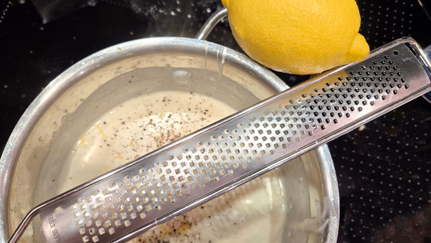 7. Zitronenabrieb untermischen und mit Salz, Pfeffer und Muskatnuss abschmecken. Eventuell noch etwas Kochwasser angießen, sollte die Sauce zu dick sein.