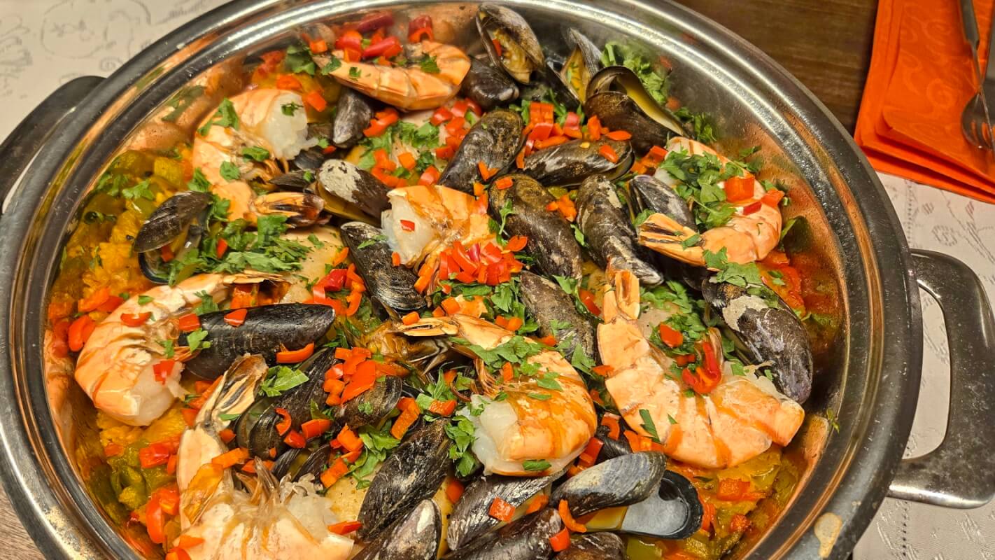 - Fertige Paella mit Petersilie und Chili bestreuen.