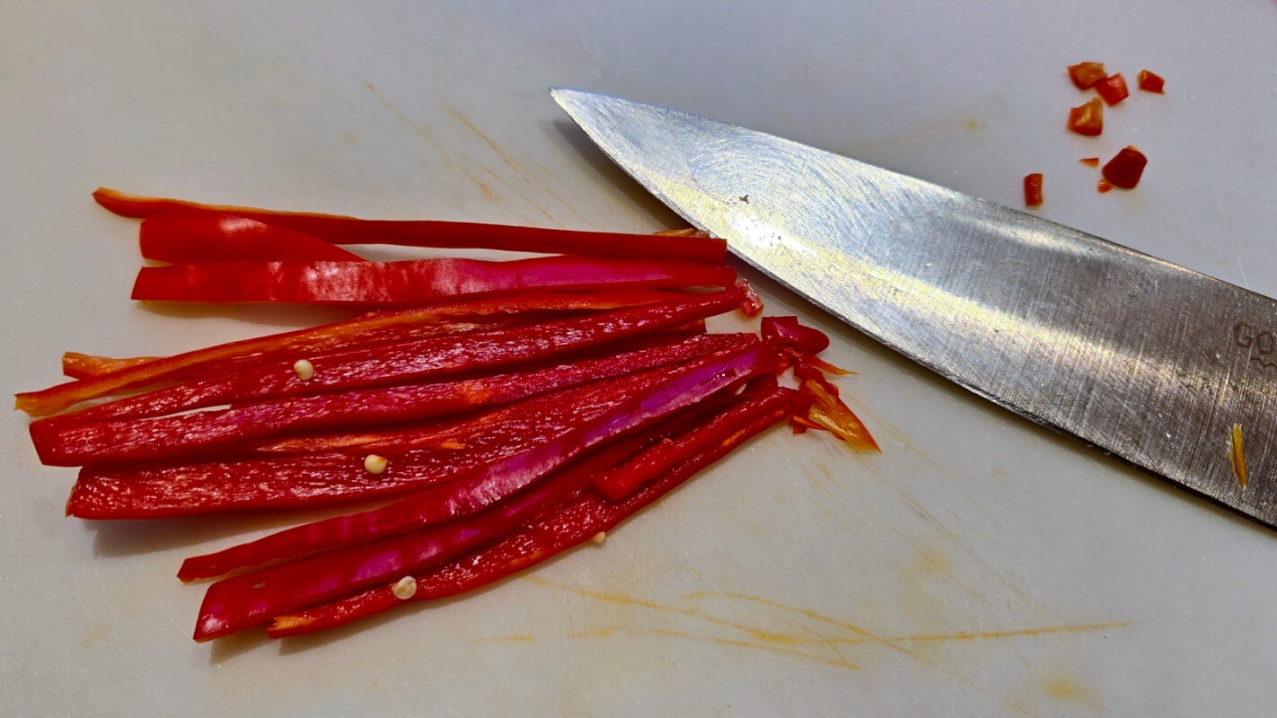 Vor allem die vielen Schalotten sind der besondere Pfiff des pikanten Rindergulasch, nicht nur wegen ihres milden, süßlichen Zwiebelaromas, sondern auch weil sie die Soße besonders sämig machen. - Die Chilis werden nun entkernt und in feine Scheiben (wie Schnittlauchröllchen) geschnitten.