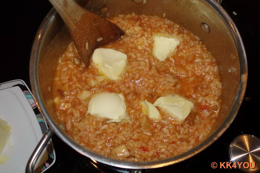 - Den Käse unterrühren und den abgedeckten Risotto noch 2-3 Minuten ruhen lassen.