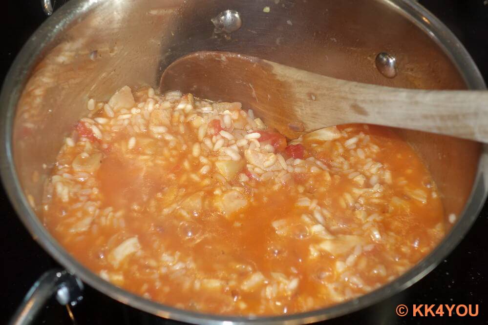 - Den abgetropften Reis zu den Tomaten und Pilzen in den Topf geben. Unter ständigem Rühren schöpfkellenweise das heiße Reiswasser angießen.