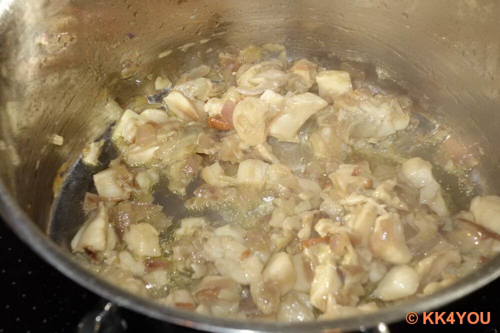- Die Zwiebeln in großem Topf im Öl weich dünsten.