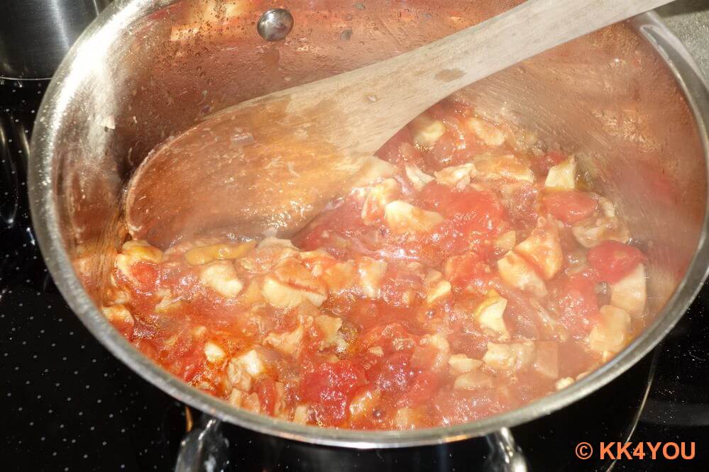 - Pilze hinzufügen und etwa 5 Minuten garen, dann die Tomatenstücke zugeben.