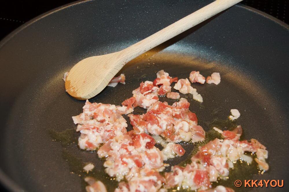 - Speck in kleine Würfel schneiden. In einer großen Pfanne mit 2 EL Öl langsam bei mittlerer Hitze ausbraten.